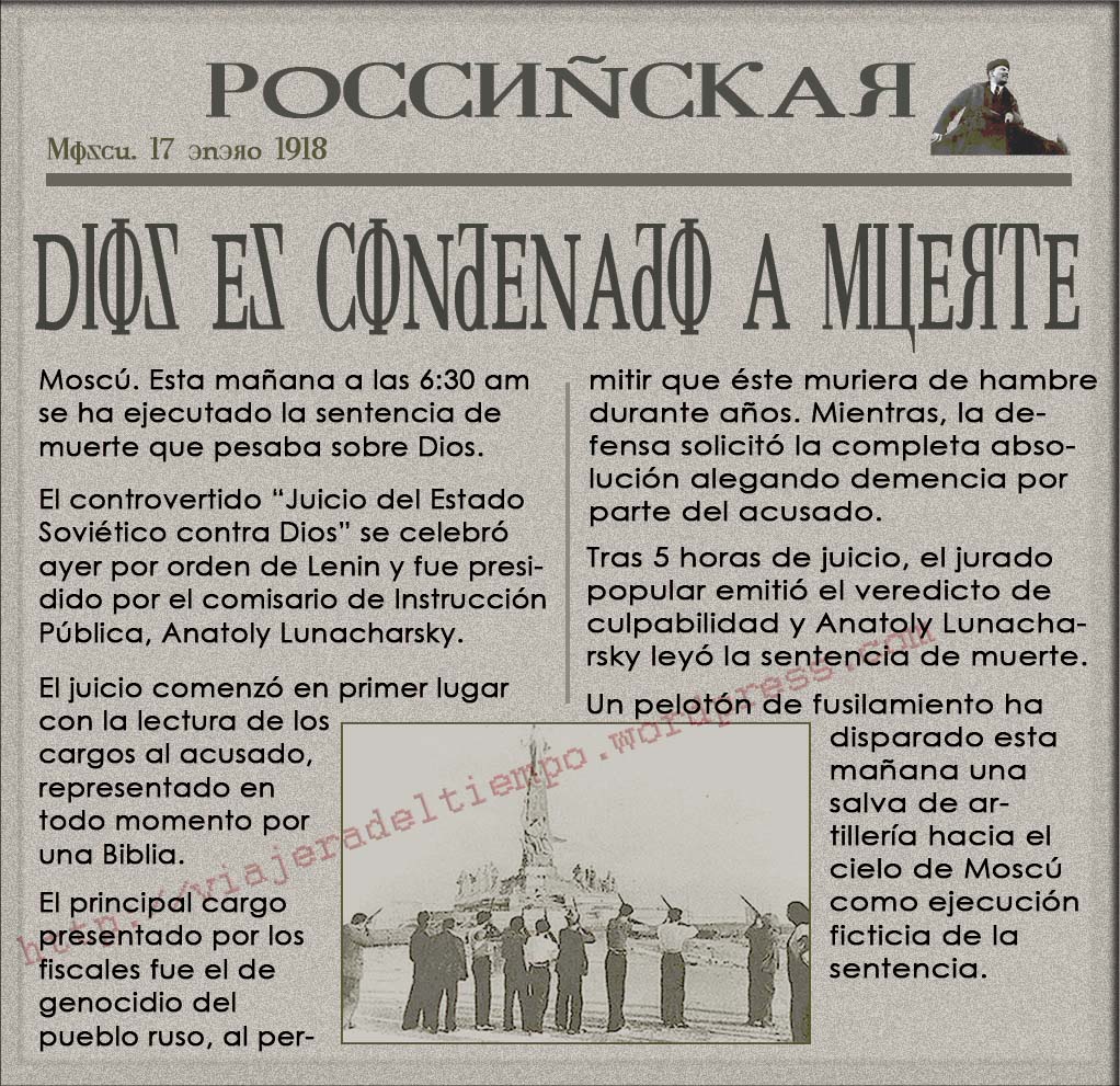 Ese día, el mismo que el de mi cumpleaños, por cierto, un tribunal popular presidido por el comisario de Instrucción Pública Anatoly Lunacharsky decidió juzgar a Dios por sus crímenes contra la Humanidad.