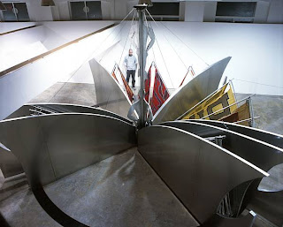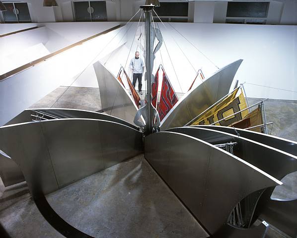 Unas 16 personas serían necesarias para poner este inmenso ventilador de techo, y de acero, en pie en el centro de la sala. Al manipularla, unas banderolas de nylon se desdoblaban para formar una serie de tiendas mientras una silueta de aluminio subía hasta el techo. Por una parte, la pieza parecería evocar los proyectos revolucionarios de Duveyrier, en los que la colaboración resulta en cierta elevación del personal y de la libertad individual que unificaría la comunidad. Por otra parte, sin embargo, las banderolas revelan cuando se despliegan una serie de epítetos: „Beggars“, „Cripples“, „Blacks“, „Aliens“, y así. Tal como Howard Fox apunta en su catálogo de la exposición en el Hirshhorn Museum de Washintong (1982), en Fan City „todo el mundo es un marginado“[1]. La colaboración provoca cierta división y por tanto se niega a si misma. La figura de aluminio podría representar un falso ideal creado por la expulsión de todo aquel que no se adecue a un estereotipo predeterminado.
